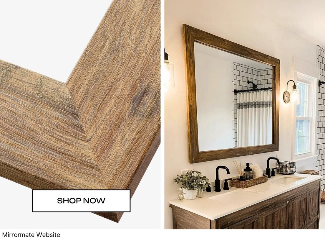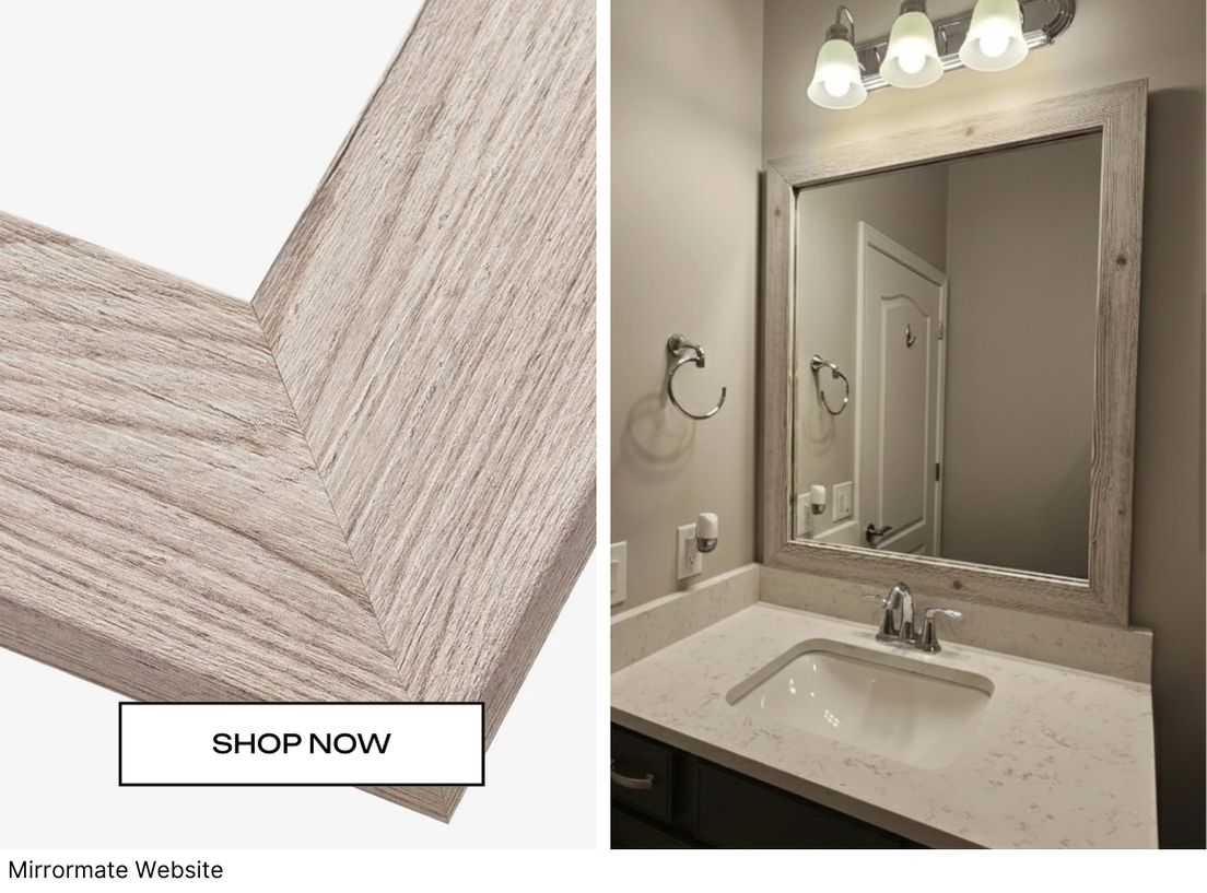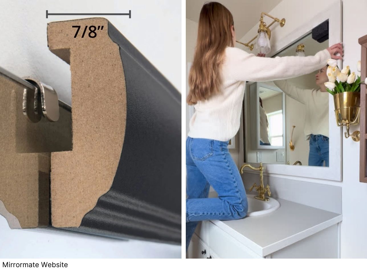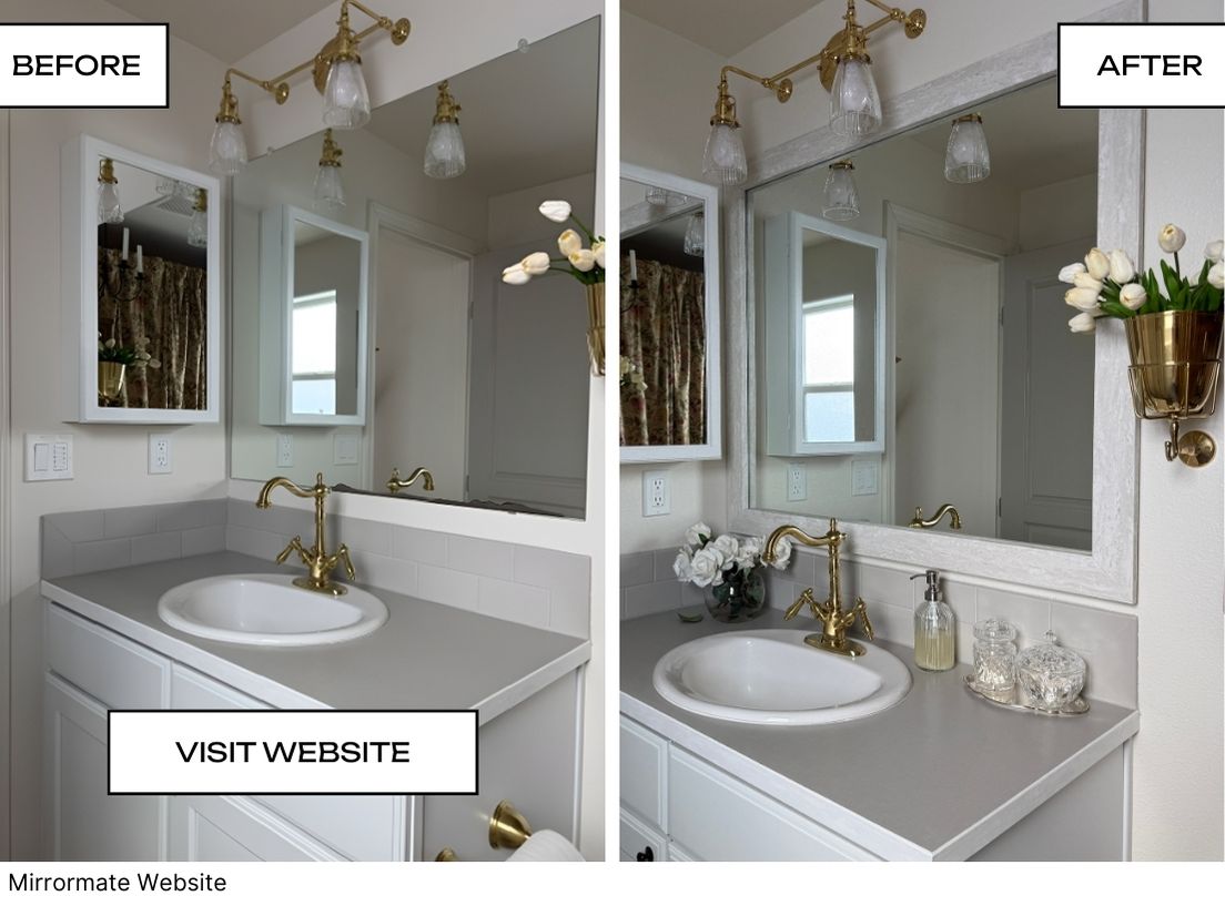 Then I came across a post about MirrorMate, a company that creates custom mirror frames designed to cover de-silvered edges. The concept was simple: the frame adheres directly to the glass, giving it a finished, built-in look — no demo, no tools, and no measuring chaos.