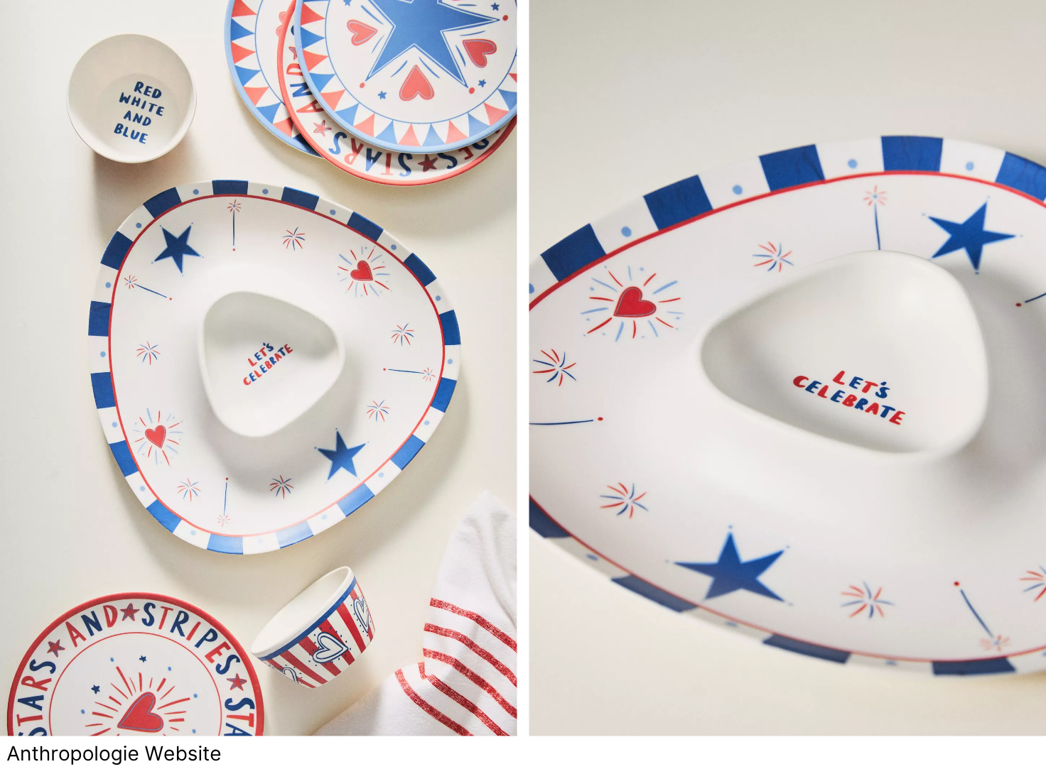 Your summer celebration table isn't complete without this whimsical melamine dining collection designed exclusively for Anthropologie by Nephthys Illustrated! In it, classic red and blue take a spin with stars, stripes, and all the works.
