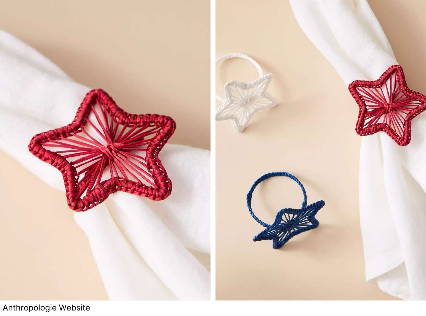 Add a touch of festive charm to your table setting with the Handwoven Star Napkin Rings, featuring vibrant red, white, and blue stars for a patriotic accent.