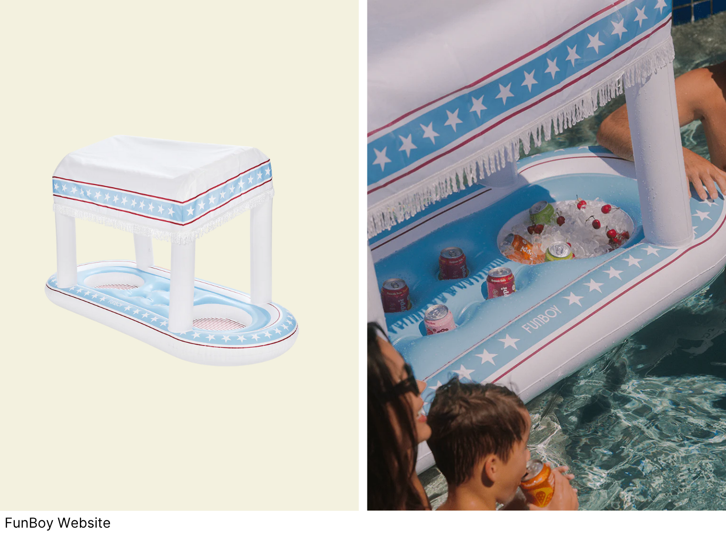 If you’re hosting a poolside BBQ or lakeside bash, the Floating Cabana Bar from FUNBOY is the ultimate Fourth of July flex. Decked out in vibrant red, white, and blue, this inflatable bar brings both function and flair to your water setup. With four cup holders, a built-in cooler, and a shaded canopy for extra chill points, it’s perfect for serving up canned mocktails, sparkling sips, or fruit skewers — all while floating in total style.