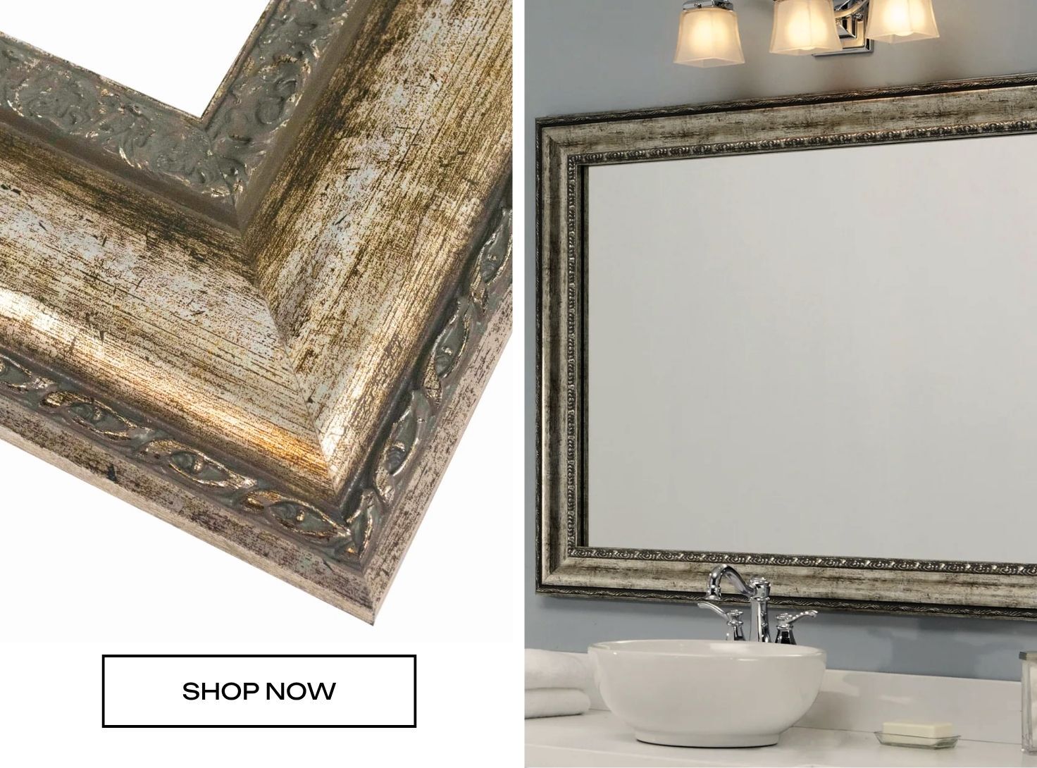 Looking for a little Hollywood Regency drama? This frame delivers. The Grandezza Aged Silver is a designer favorite because it feels upscale without being flashy. It gives plain mirrors a gorgeous antique-style finish that works equally well in traditional and modern homes.