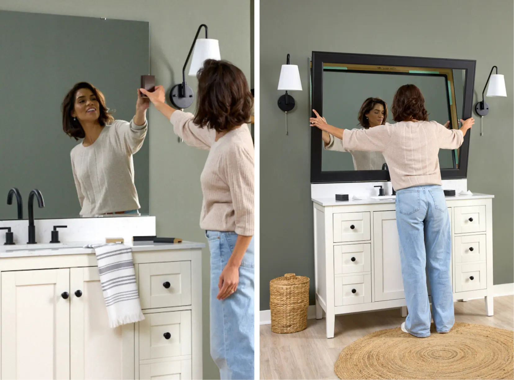 MirrorMate makes custom-fit mirror frames that attach directly to your existing builder-grade mirror. No removing the mirror. No wall damage. No tools required. The frame arrives in four pre-cut pieces, assembles with included corner connectors and adhesive, and installs in under 30 minutes. Frames start at $99, and the result looks like work that cost significantly more.